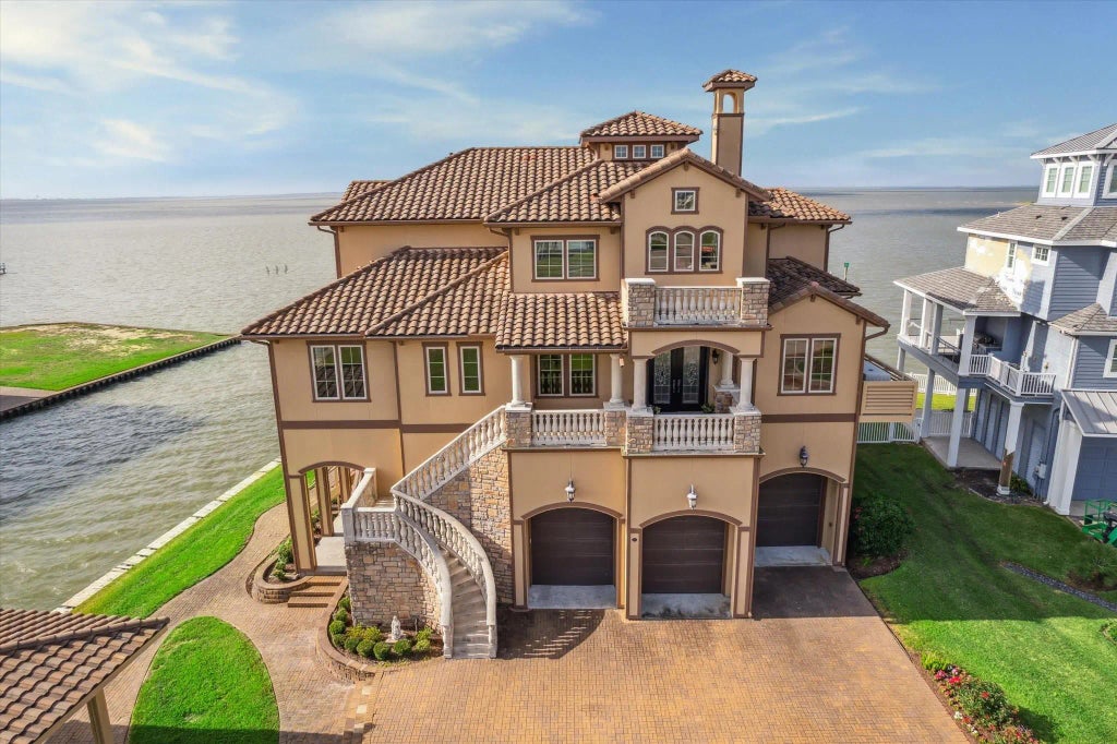 Experience luxury coastal living in this stunning Mediterranean-style bayfront home, perfectly positioned to capture sweeping bay views from every level. Situated on a prime homesite w/ nearly 280' of waterfrontage—85' on West Galveston Bay—this architectural masterpiece showcases exceptional quality construction, with solid craftsmanship evident in every detail. Inside, an open-concept layout is designed for entertaining and everyday comfort, with expansive windows framing breathtaking water views. Multiple balconies and outdoor living spaces invite you to enjoy the serene bayfront setting, complemented by a sparkling pool that offers the perfect place to relax or entertain. A private boathouse provides direct access to the ICW for boating and recreation. Built to last and beautifully appointed throughout, this bayfront retreat is a rare blend of timeless Mediterranean elegance, modern luxury, and enduring construction quality. Modern luxury and enduring construction quality!