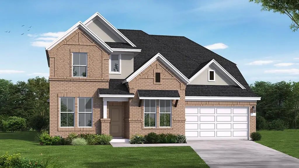 Step into timeless elegance with this light brick beauty accented by classic stucco detailing. Inside, you’ll find a thoughtful layout with two bedrooms downstairs, including a luxurious primary suite featuring dual sinks, dual walk-in closets, a relaxing garden tub, and a spacious walk-in shower with a seat. The heart of the home is the open-concept kitchen with a large island, built-in appliances, a 5-burner cooktop, and a butler’s pantry connecting to the formal dining room—perfect for entertaining. The kitchen flows seamlessly into the bright great room with soaring ceilings and tall windows that fill the space with natural light. A first-floor media room and private study add to the functionality of the main level, along with a convenient powder bath. A curved staircase with wrought iron railing leads to the second floor, where you’ll find two more bedrooms, two full baths, and a spacious game room in between for added privacy and flexibility.