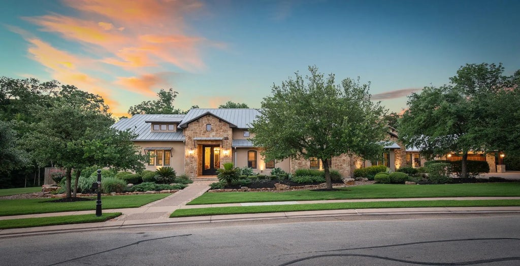 This Traditions estate situated on nearly an acre epitomizes hill country luxe. Spread out in 6,500+ sq ft of single story comfort. The formal dining room features a wall of windows to survey the resort style grounds. Living areas feature the warmth/durability of natural mesquite underfoot. Recently updated, the light, modern kitchen features a state of the art Kitchenaid appliance suite, custom cabinets, high-end quartzite, and butler’s bar. Massive fireplace bisects two large great rooms, and stately study features a 600+ bb wine cellar. The primary features a fireplace, breathtaking spa bath, and massive walkin closet. Four generous guest suites feature ensuite baths, sizeable closets. Full exercise room with kitchenette near by could easily convert to inlaws’ quarters. Stunning outdoor areas with 4,000+ sf of covered space, dining gazebo, infinity pool with waterfalls. Immaculate xeriscape/hardscape with both wooded privacy and view of three of Nicklaus’ best-designed holes.