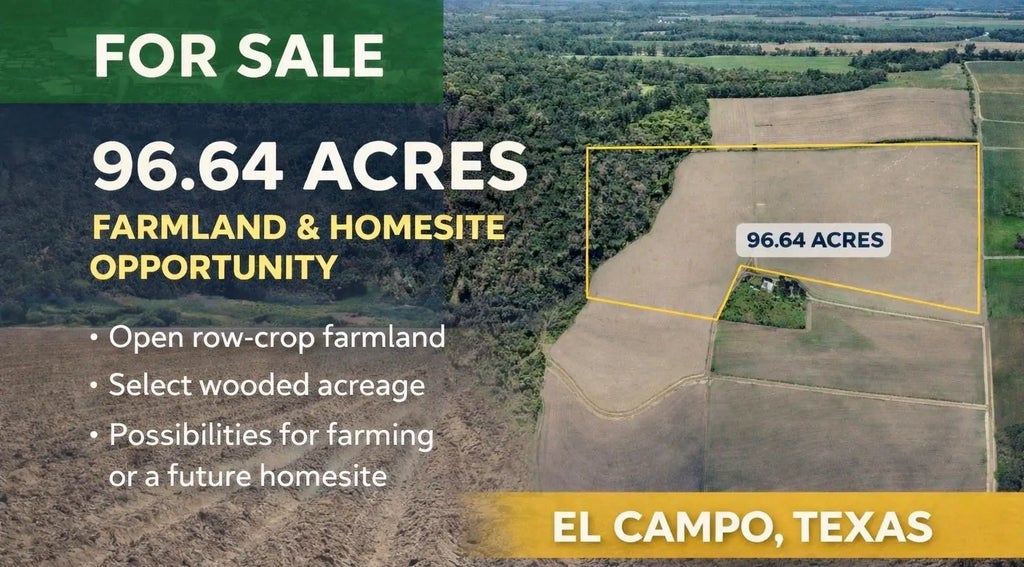 Approximately 96.64 acres of productive agricultural land located in El Campo, Texas. This tract is primarily open row-crop farmland, featuring long, uniform fields well-suited for continued farming operations or agricultural investment. The property also includes select wooded acreage along the western boundary, offering natural privacy and attractive surroundings that may lend themselves well to a future homesite or rural retreat, while still maintaining strong agricultural usability. With County Road 385 access, this versatile tract provides an excellent opportunity for farming, investment, or the creation of a private country homesite, allowing a buyer to shape the land to fit their vision. Come take a look and make it your own. Boundary lines shown in marketing materials are approximate; see survey for exact boundaries.