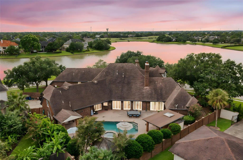 This sprawling stately home in Pearland's Lakecrest Estates Community truly shows pride of ownership. Outdoors, enjoy an unbelievable front porch view of the lake, private backyard oasis with pool, spa and gazebo surrounded by a brick wall, and gated auto court offering ample parking plus 3 car garage. Downstairs, you will find a grand family room with tall ceilings and beautiful views of the pool area, a home office large enough to use as a game room, library, comfortable primary suite that includes ample sitting area and one of the three fireplaces, chef-style kitchen with gourmet stainless appliances, custom built walk-in pantry with coffee bar and recently installed Pella Windows throughout. Go up the main staircase to four more bedrooms, 3 baths and media room with projector, screen and sound system. Atop the back stairs sits an over the garage apartment with full bath, and kitchen connections. Great for company, family, home office. You will love the architecture of this home!