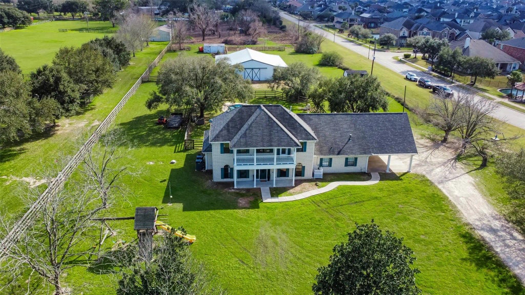 Nestled on just under 5 acres, this stunning estate offers the perfect blend of country charm & modern convenience. Lightly restricted, tons of place to play! A tree-lined driveway welcomes you to this nearly 4,000 sq. ft. home, featuring 4 beds, 2.5 baths, & a sparkling pool w/ a separate in-law suite. The spacious game room & office are separate from the main living area w/ a private staircase, ideal for a quilting or craft studio, dance space, or private office w/ a direct entrance. A private guest suite w/ a bedroom, bath & kitchen is perfect for multigenerational living or in-laws. Gorgeous oak trees adorn the property, creating a picturesque setting. The barn serves as a versatile workshop or can accommodate livestock. Recent updates include a beautifully remodeled kitchen, gleaming wood floors, & a refreshed primary spa-like bath. Enjoy peaceful mornings on the usable balcony while being just seconds from the heart of Cypress. Now’s the time to own land & stay zoned to CFISD!